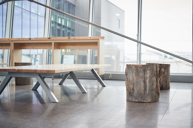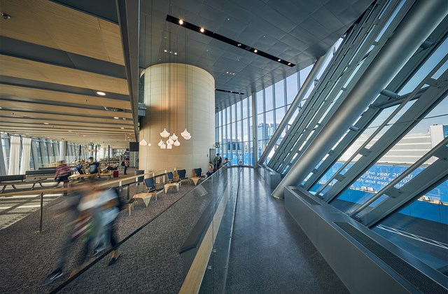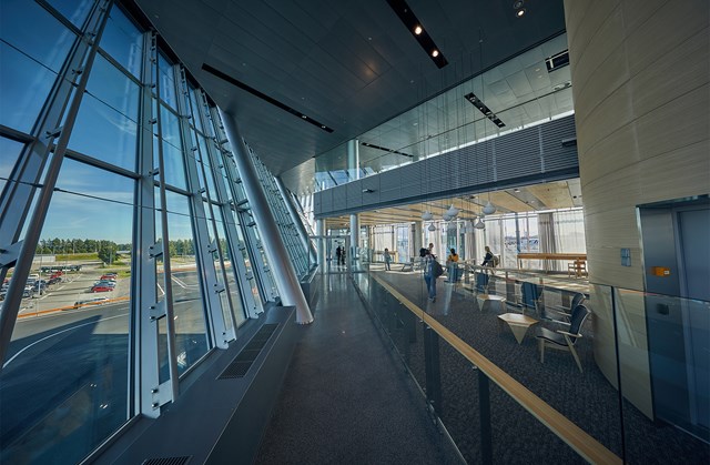 La terminal recibe a los viajeros con una gran superficie acristalada, que transmite una sensación de amplitud. Esta gran superficie de vidrio también proporciona gran cantidad de luz natural, algo muy demandadas en todos los espacios públicos. El diseño tuvo en cuenta todas las características exigidas al vidrio, es decir, protección contra cargas térmicas excesivas y sobrecalentamiento, y además se exigía el aislamiento del sonido y aire frío en el exterior. Las dos últimas exigencias fueron un importante reto debido a las extremas condiciones climáticas durante la mayor parte del año y también debido a las condiciones acústicas por la ubicación y uso del edificio. Además, se tuvo en cuenta el diseño y el coste final del vidrio. Estos desafíos fueron respondidos por Lasiliiri Oy, en cooperación con Teräselementti Oy con gran éxito.