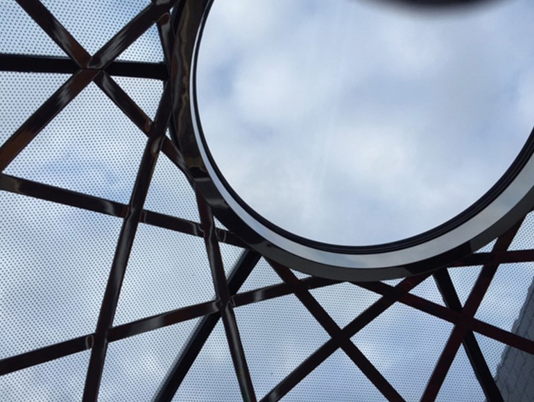 Le matériau dichroïque employé fait que la façade change en fonction de l’heure de la journée et de la perspective depuis laquelle nous la regardons, ce qui donne une finition unique et spectaculaire.