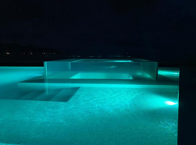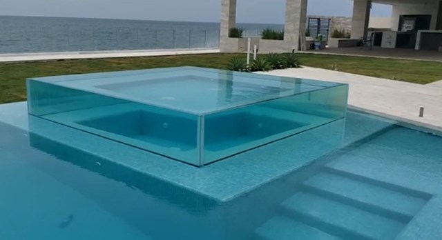 La composition des panneaux pour le vitrage de la piscine est de 5 verres ultra clairs de 10 mm. De plus, les 4 verres internes sont trempés et le dernier est brut afin de supporter les autres en cas de rupture spontanée. Les verres sont laminés avec Evalam Visual à une épaisseur de 1,52 mm entre eux. Evalam Visual a été développé afin d’avoir une résistance longue et forte à l’humidité, éviter les délaminages produits par des conditions climatologiques ou des environnements peu favorables avec une forte présence d’humidité et de hautes températures. Le scellement des joints a été réalisé au moyen de silicone structurelle transparente. Les panneaux ont été enterrés à 25 cm dans un canal en béton, et appuyés sur un lit en uréthane et fixés à l’aide de mortier à prise rapide.